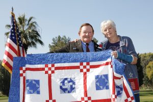 Veteran Danny Crosser is presented with a Quilt of Valor by Rose Rhoads of the Quilt of Valor Foundation.[/caption]