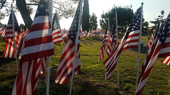 Dennis FletcherThe city erected 1776 flags in Gibbel Park to celebrate Veterans Day.[/caption] ■ Chronicle News Staff Hemet and San Jacinto celebrated Veterans Day on a Sunday this year with a series of events highlighted by ceremonies in Gibbel Park and a memorial at Golden Era Productions, among other acts to honor those who fought and died in the nation’s many wars. Gibbel Park was the focus of the holiday throughout the prior week as the city erected no fewer than 1776 American flags on Nov. 3, each with a yellow ribbon tied to the flagpole. Families and individuals arrived for the 9 a.m. ceremony at the Veterans Memorial attended by officials and members of the Hemet City Council, then spent the rest of the day visiting vendor booths and on-site demonstrations. There was a classic car show, with prizes, sponsored by T.H.E. Equestrian Center. The crowd got to listen to music, participate in raffles, see jumper horses, and talk with vendors who were displaying their goods and services. Clubs and organizations took advantage of the opportunity to demonstrate their activities. [caption id="attachment_14843" align="alignleft" width="300"]
